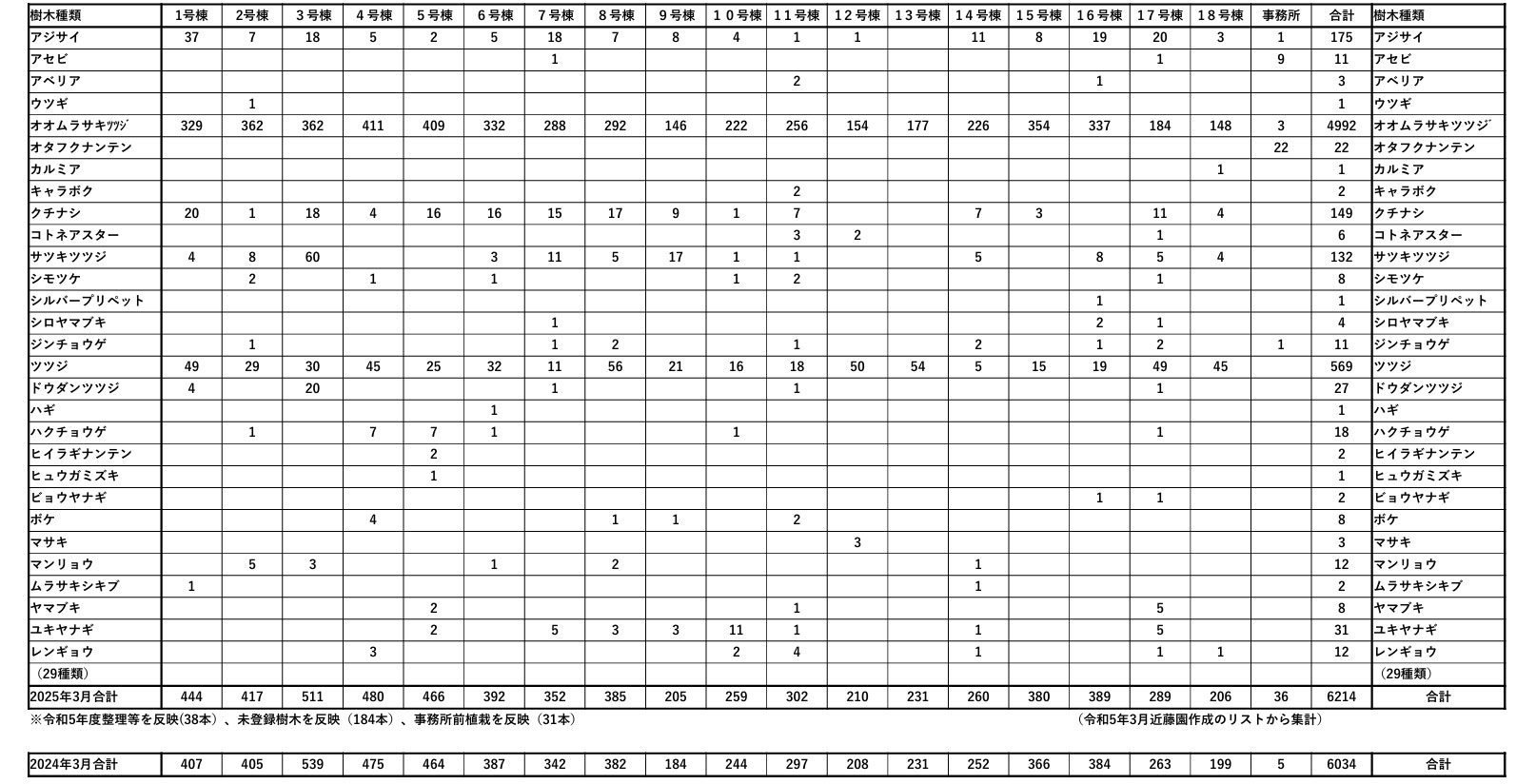 低木 号棟別樹木数集計(2025.3月現在)